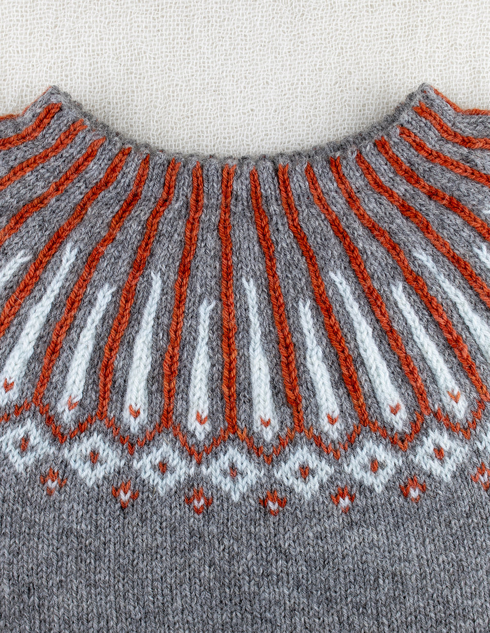Ida sweater is knitted in 3 ply yarn from the Norwegian white sheep, a soft and nice yarn for knitting. Knitted from the bottom to top.
