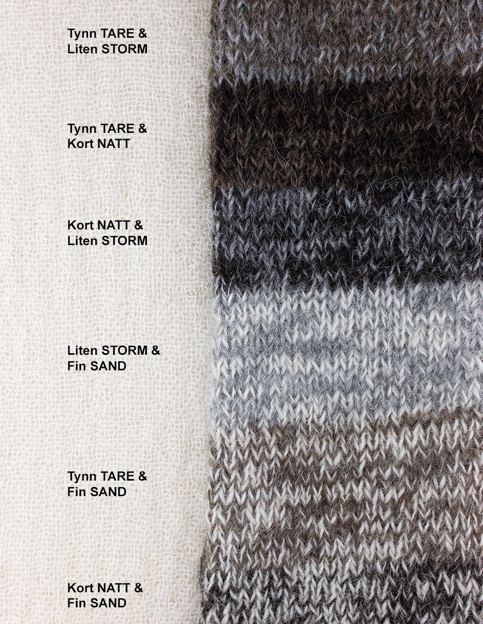 Barnevesten på bildet veier 114 gram, og er strikket med Liten STORM og Kort NATT i samme tykkelse. Til en voksen størrelse trengs det omtrent 200 g.